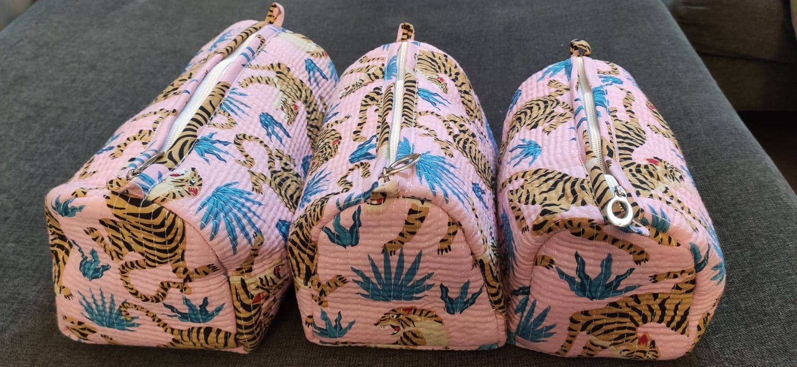 Crafted from premium cotton and hand-printed with delicate tiger motifs in baby pink, these quilted bags combine artisanal beauty with everyday practicality.