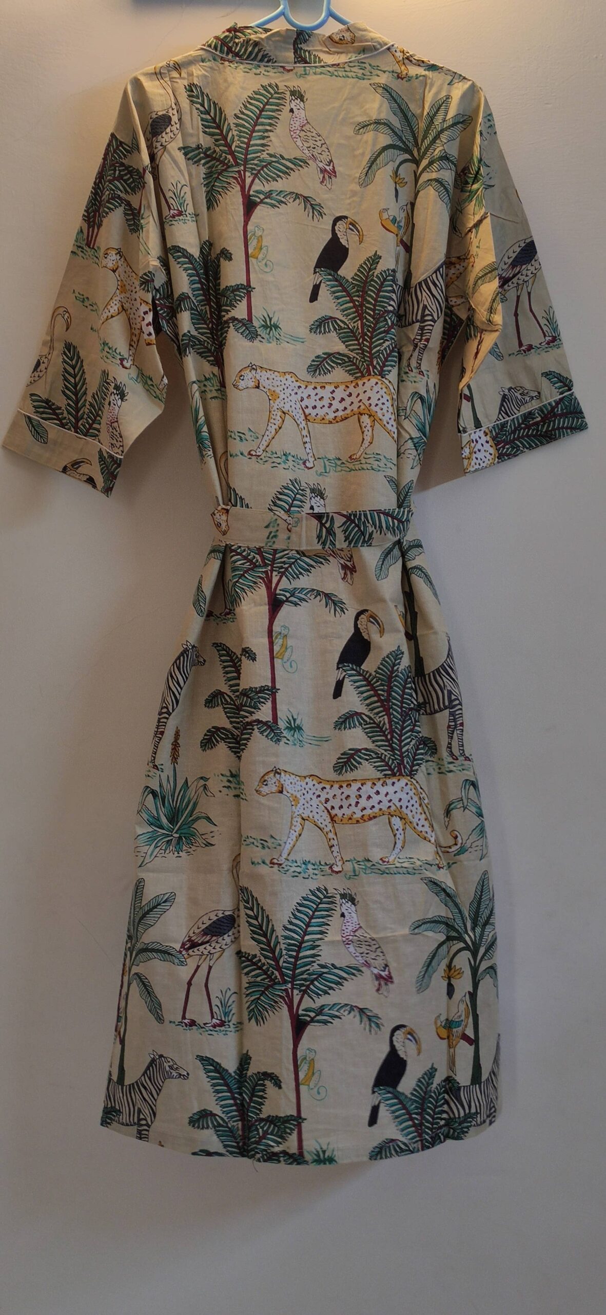 Step into effortless elegance with our Beige Safari Cotton Kimono, featuring a beige base adorned with exotic birds, zebras, and lush palm motifs. Crafted from soft, breathable cotton, this kimono is perfect for lounging, layering, or adding a tropical touch to your day.