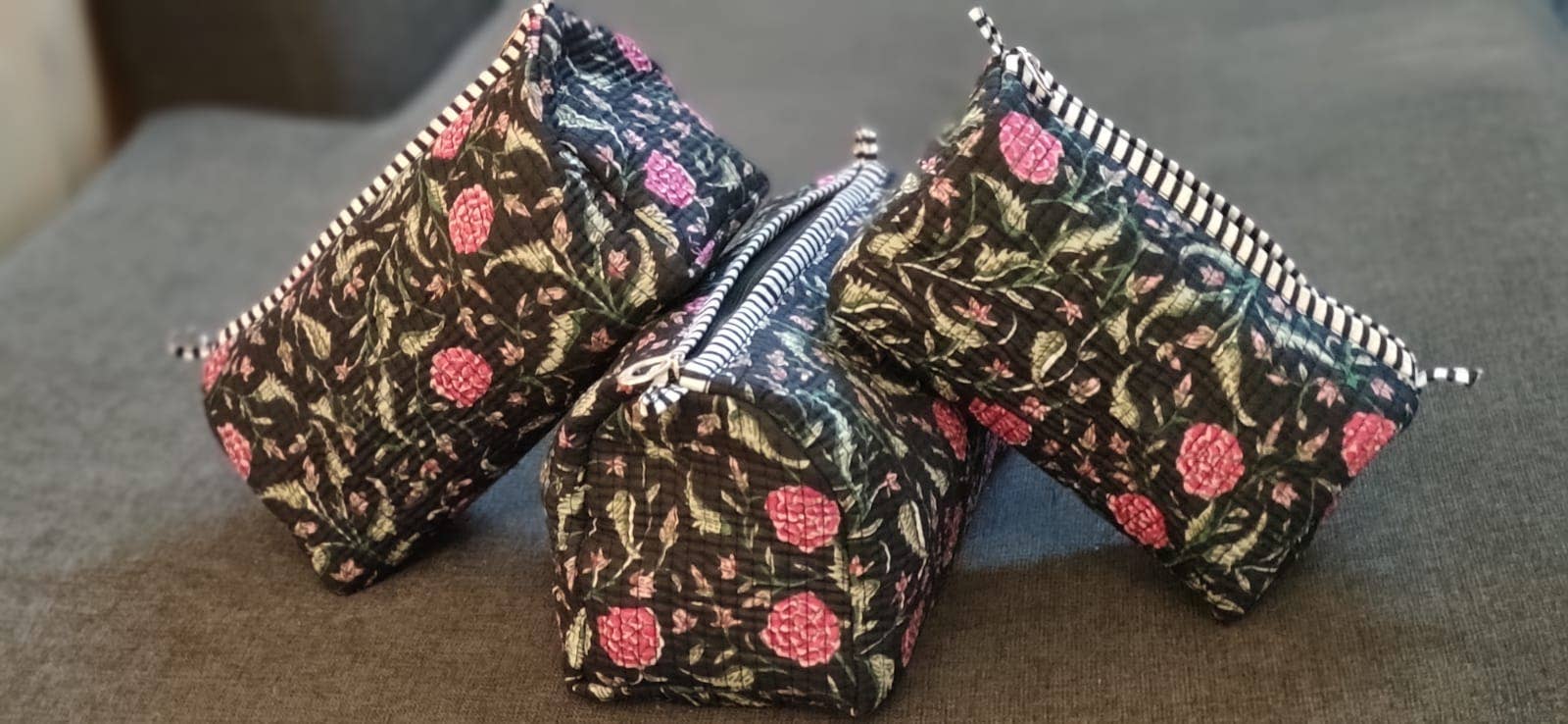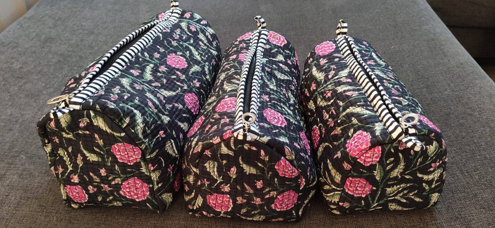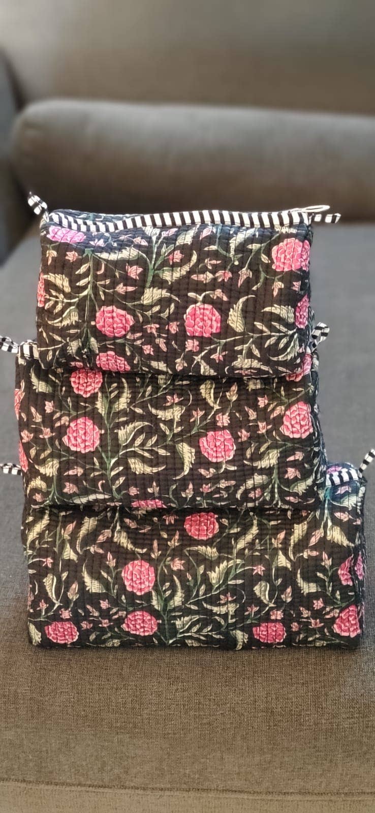 Handcrafted from premium cotton and detailed with pink floral prints on black base, these quilted bags bring a stylish edge to your beauty routine.