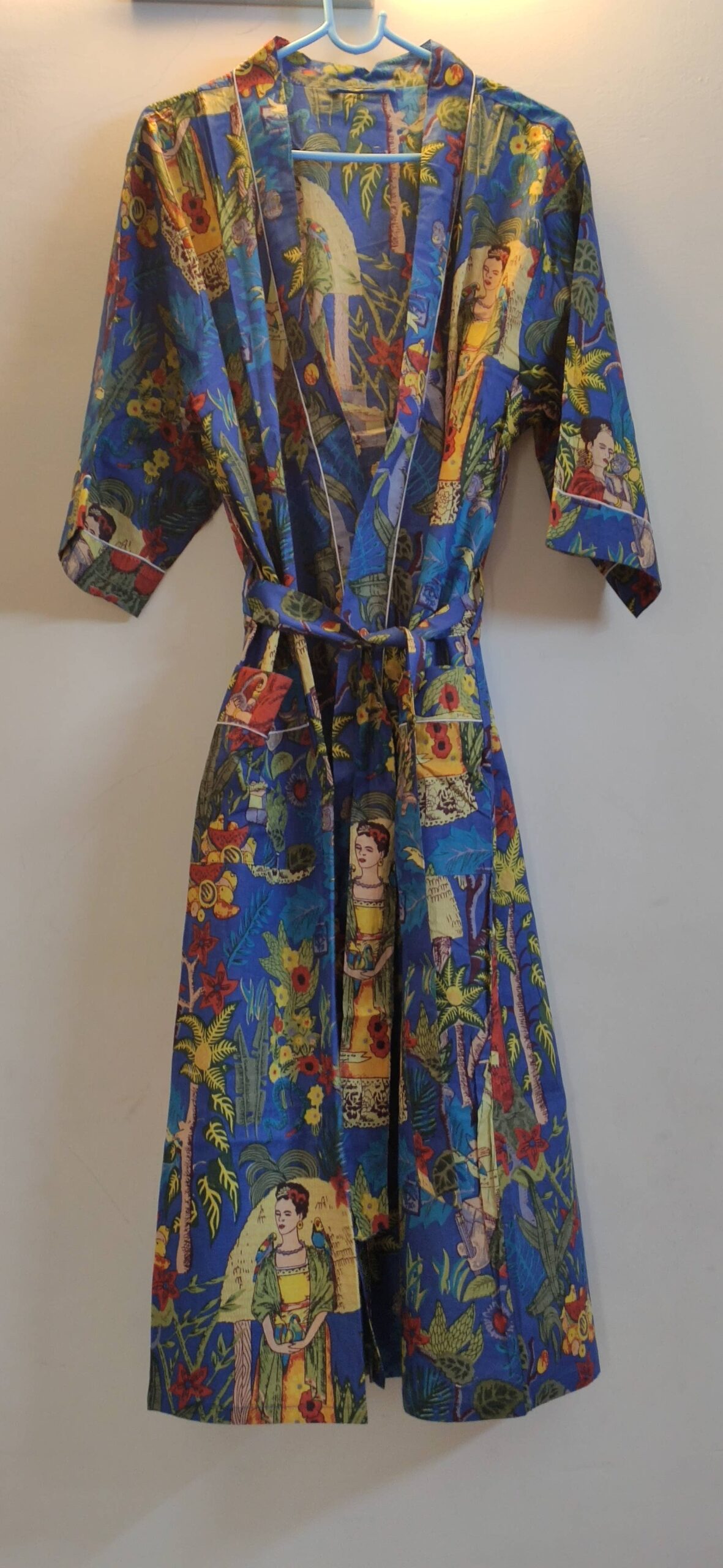 Inspired by the spirit of art and color, our Blue Frida Cotton Kimono celebrates creativity and individuality. Featuring a vivid print of Frida surrounded by lush tropical motifs, this kimono is a wearable piece of art.