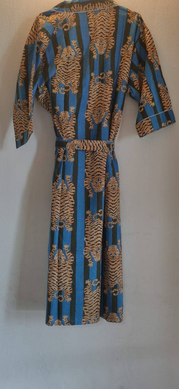 Wrap yourself in effortless style with our Blue & Green Cotton Kimono, featuring a striking tiger print on a blue & green base. Made from soft, breathable cotton, it’s perfect as a lounge layer, beach cover-up, or statement outerwear.