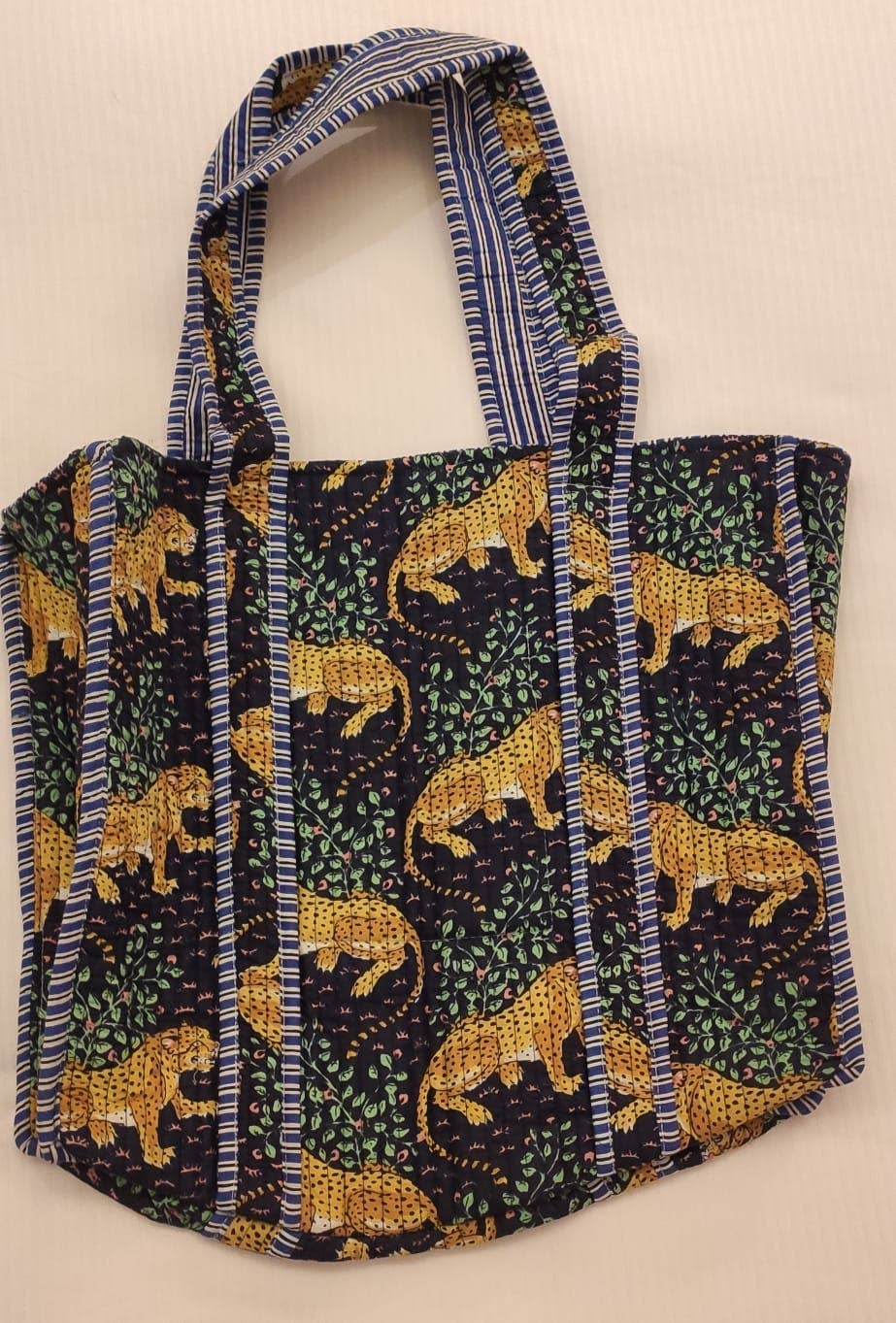 Bold, beautiful, and built for everyday adventures, our Blue Jungle Quilted Tote Bag features a striking leopard print on soft, durable cotton. The handcrafted quilted design offers both structure and protection, while striped handles add a stylish contrast.