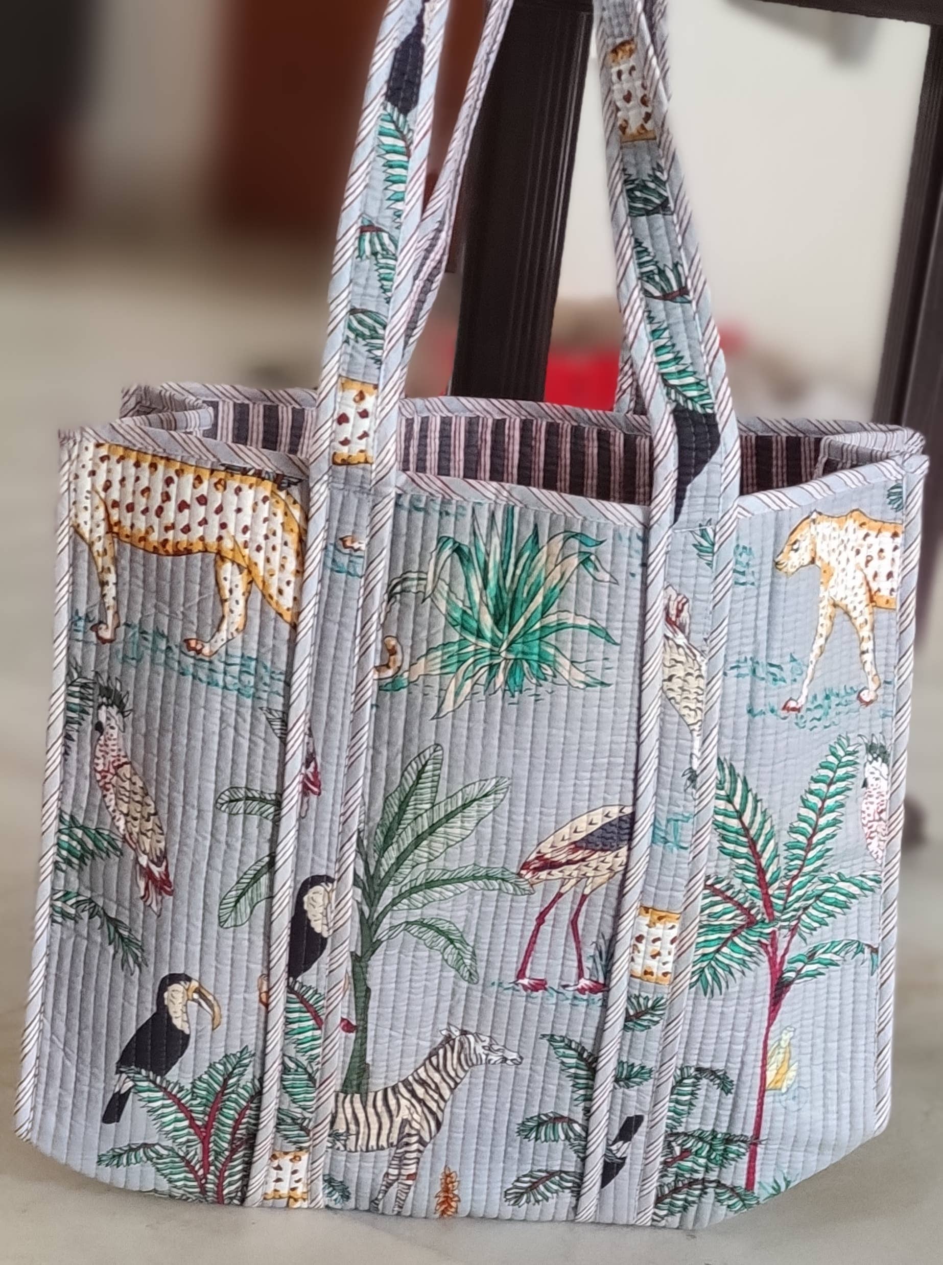 Bring a touch of the wild wherever you go with our Safari Gray Quilted Cotton Tote Bag. Featuring a charming hand-drawn safari print with zebras, cheetahs, and tropical foliage, this quilted tote perfectly blends style and functionality.