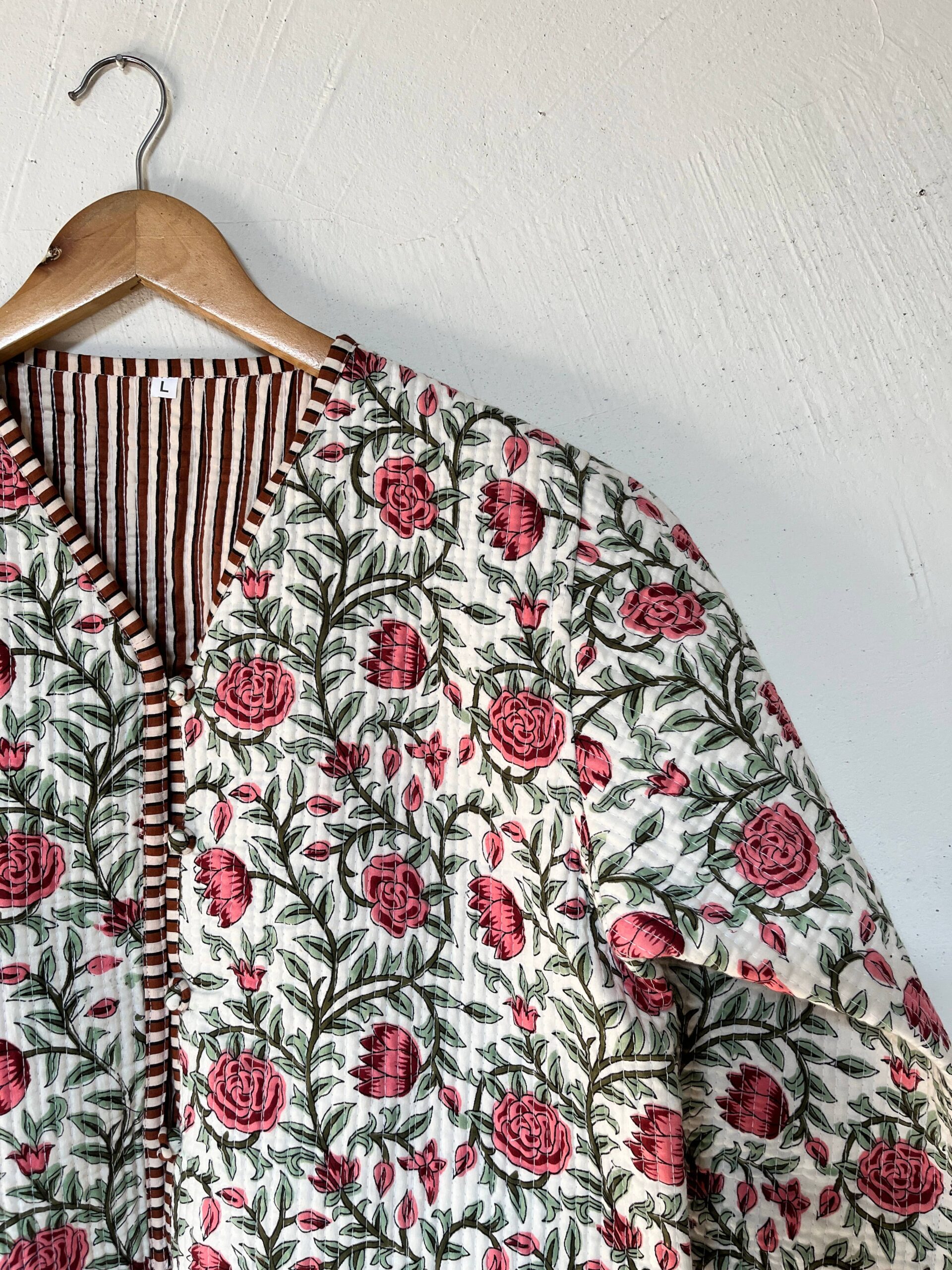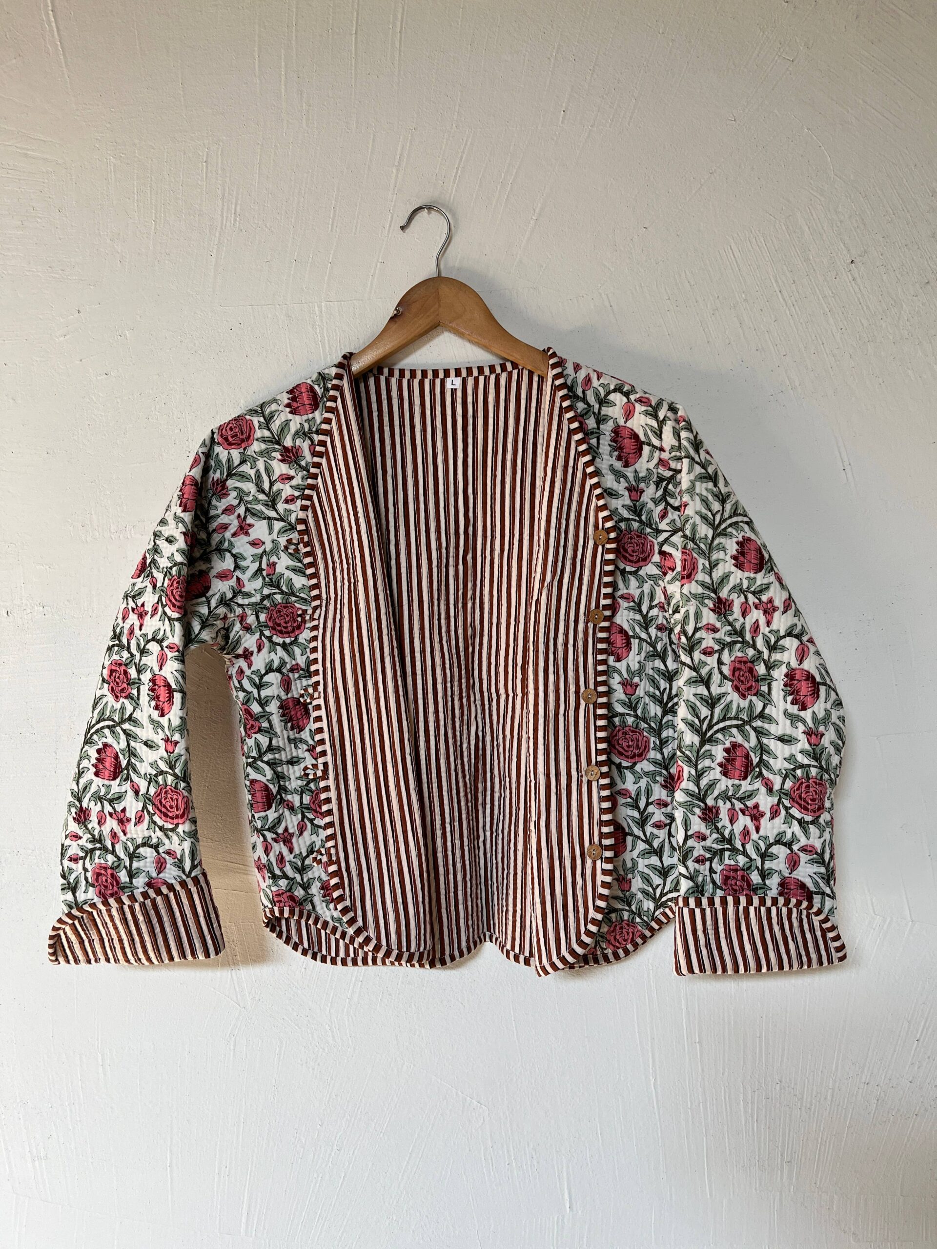 Crafted from high-quality cotton, our reversible quilted jacket has two front pockets, and handmade cotton buttons. The jacket is fully reversible, featuring a solid color/striped fabric on the inside, allowing you to switch up your look depending on your mood or outfit.