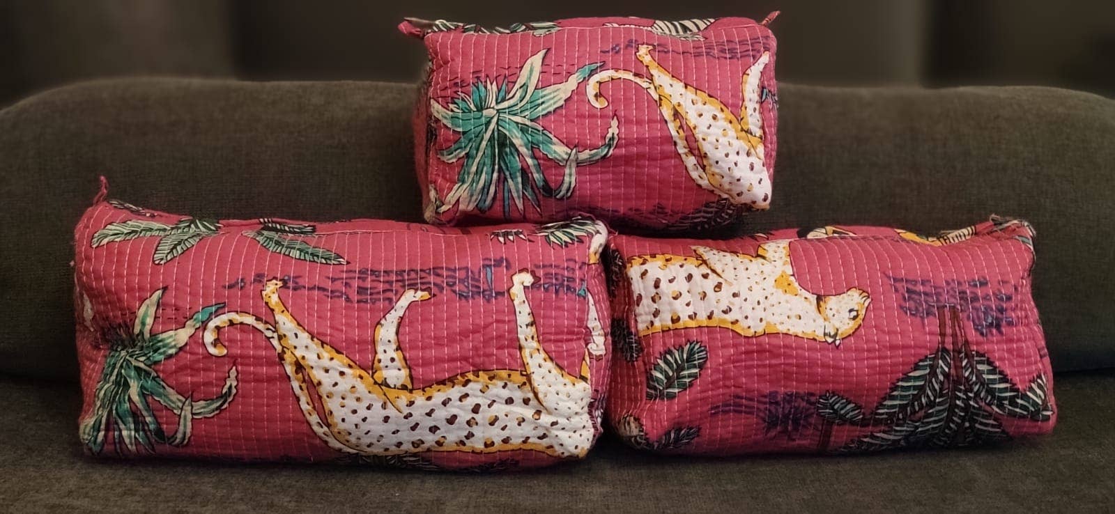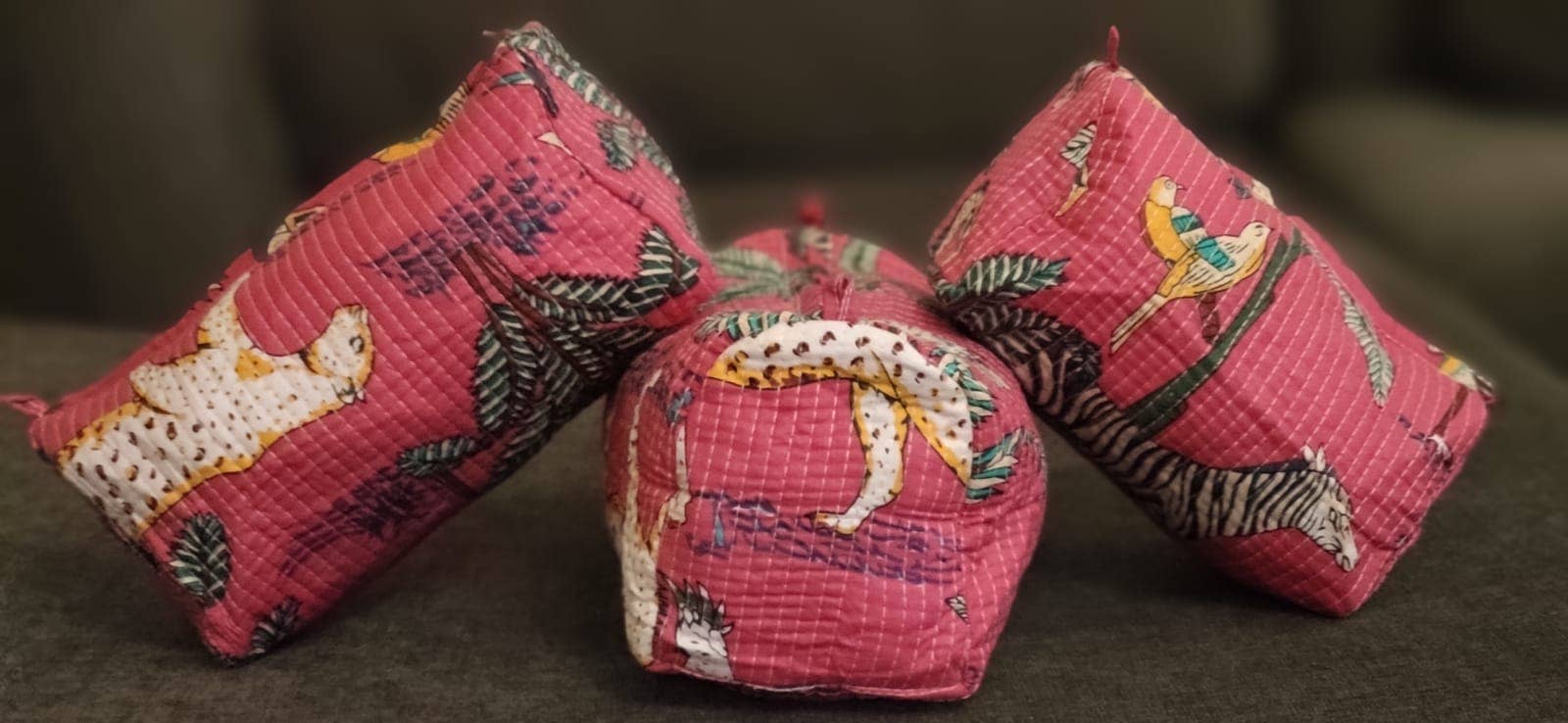 Bring a touch of the tropics to your everyday routine with our Pink Jungle Quilted Cotton Makeup Bags. Featuring playful hand-printed designs of zebras, toucans, and tropical birds amidst lush green palms on a lively fuchsia-pink base, these bags are equal parts fun, functional, and fabulous.