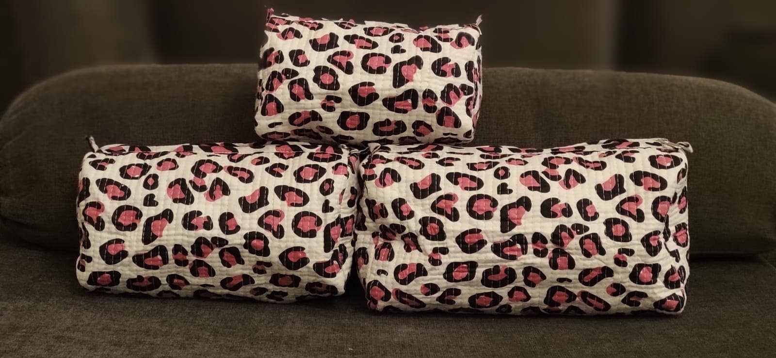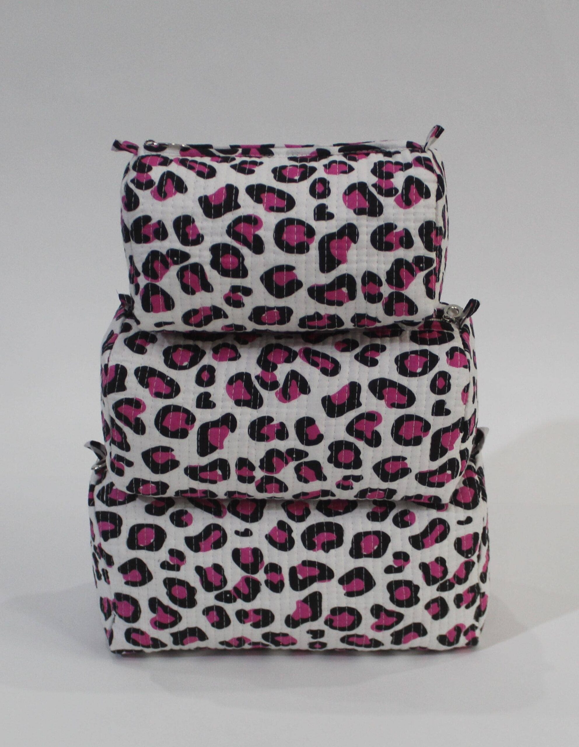 Fierce meets fun with our Pink Leopard Quilted Cotton Makeup Bags! Designed to turn heads, these chic pouches feature a bold leopard print in pink and black on a white base, the perfect mix of wild and stylish. Made from soft quilted cotton, they’re padded and lined to keep your essentials safe while adding a pop of personality to your daily routine.