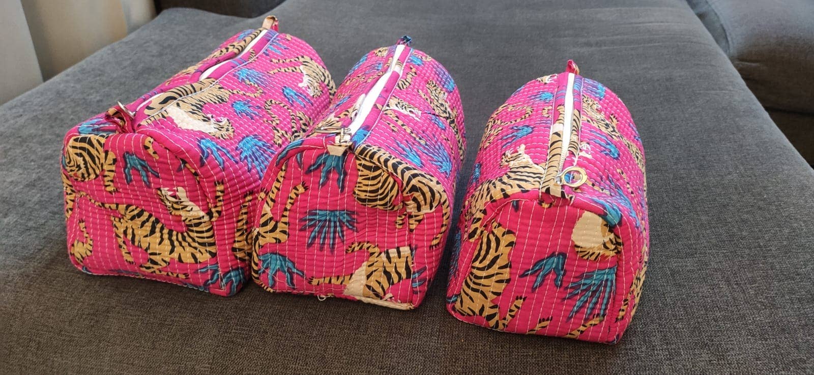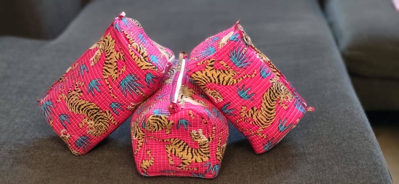 Make a bold statement with our Pink Safari Quilted Bag Set. Crafted from soft, breathable cotton, these vibrant pink bags feature striking tiger motifs and tropical accents, the perfect mix of fun and function.