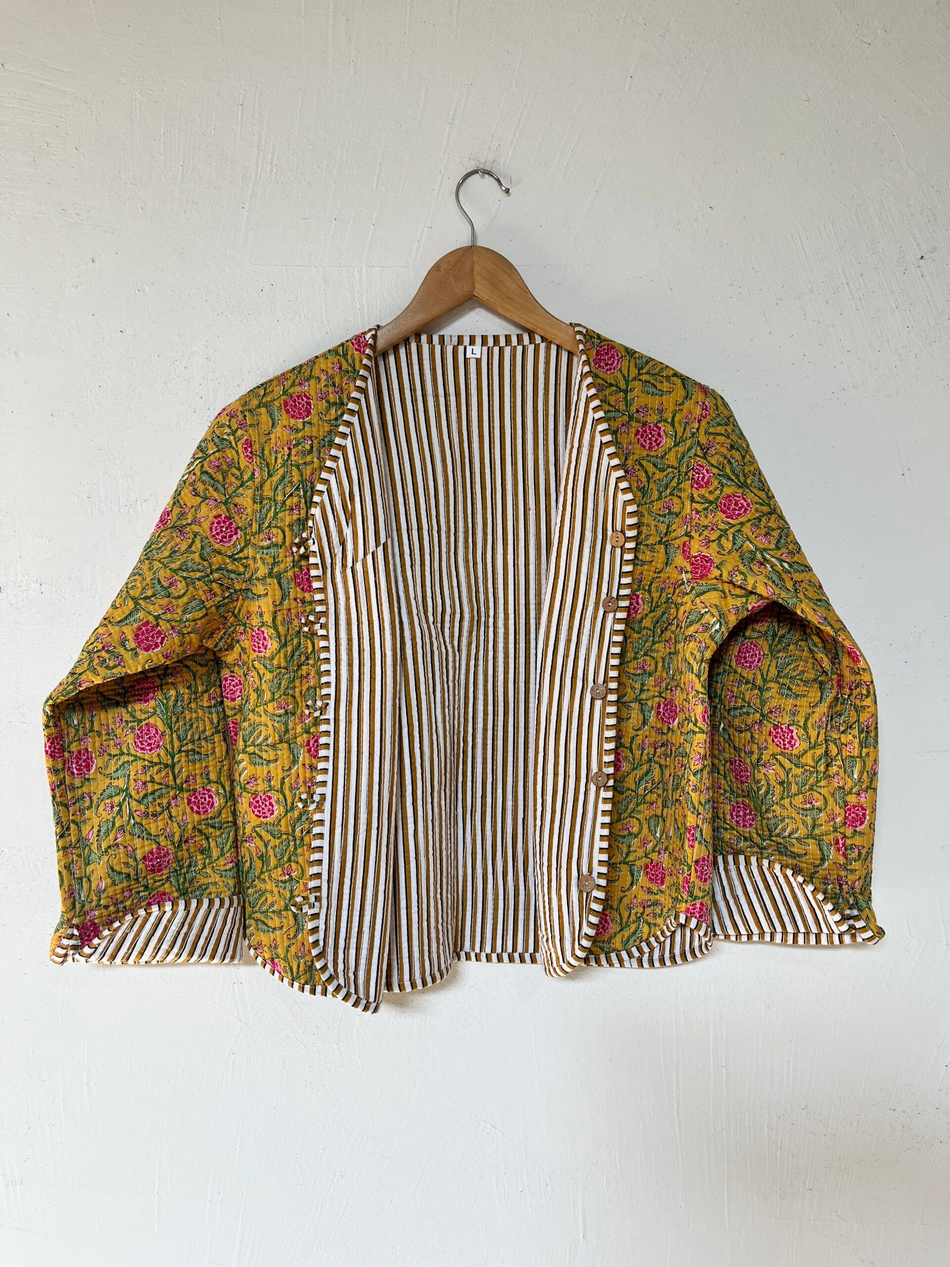 Brighten up your wardrobe with our Sunshine Bloom Reversible Cotton Jacket. Crafted from soft, breathable cotton, this jacket features a lively yellow base with floral prints in pink and green, balanced with a striped lining for a chic reversible option.