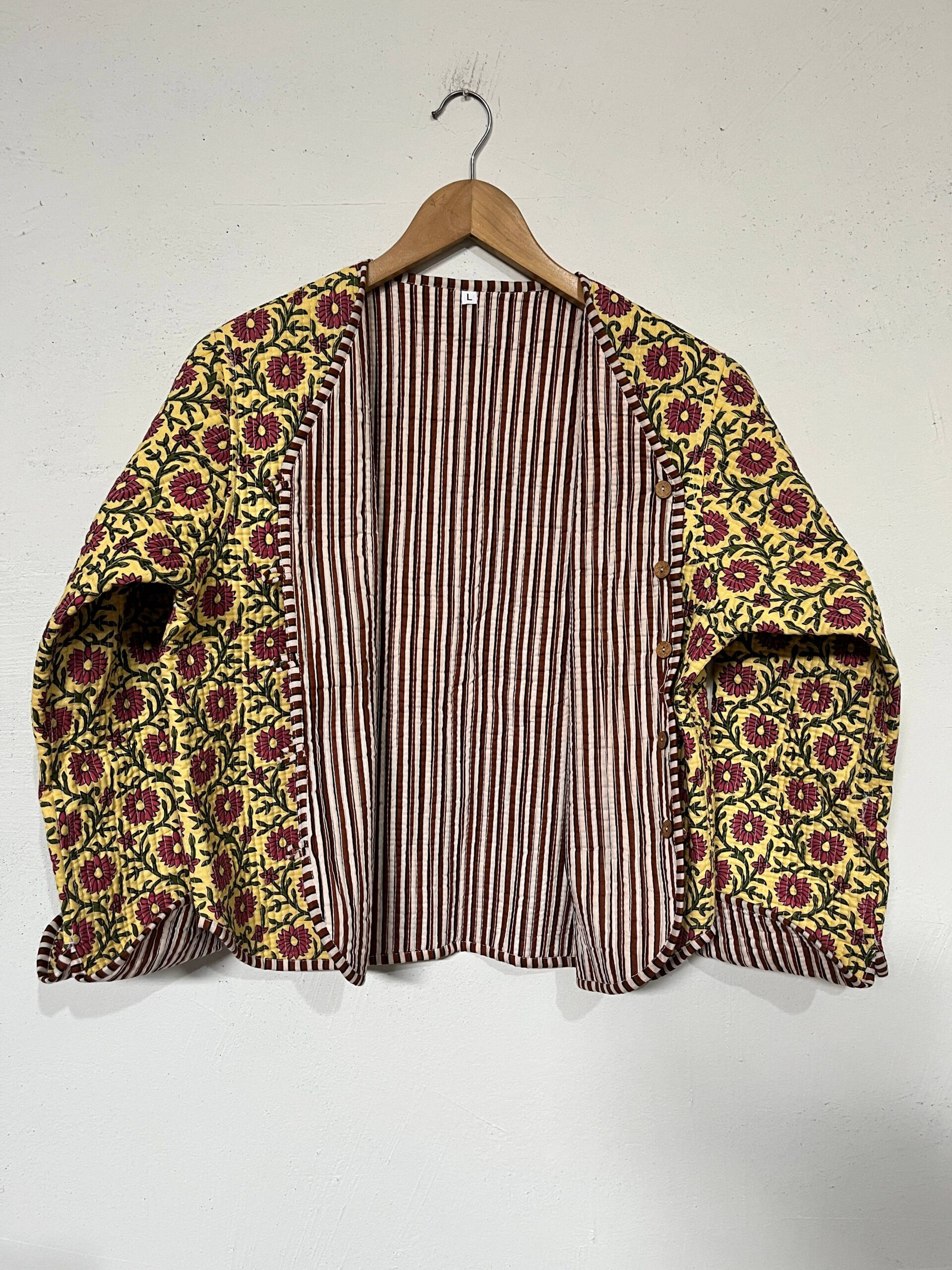 Crafted from high-quality cotton, our reversible quilted jacket has two front pockets, and handmade cotton buttons. The jacket is fully reversible, featuring a solid color/striped fabric on the inside, allowing you to switch up your look depending on your mood or outfit.