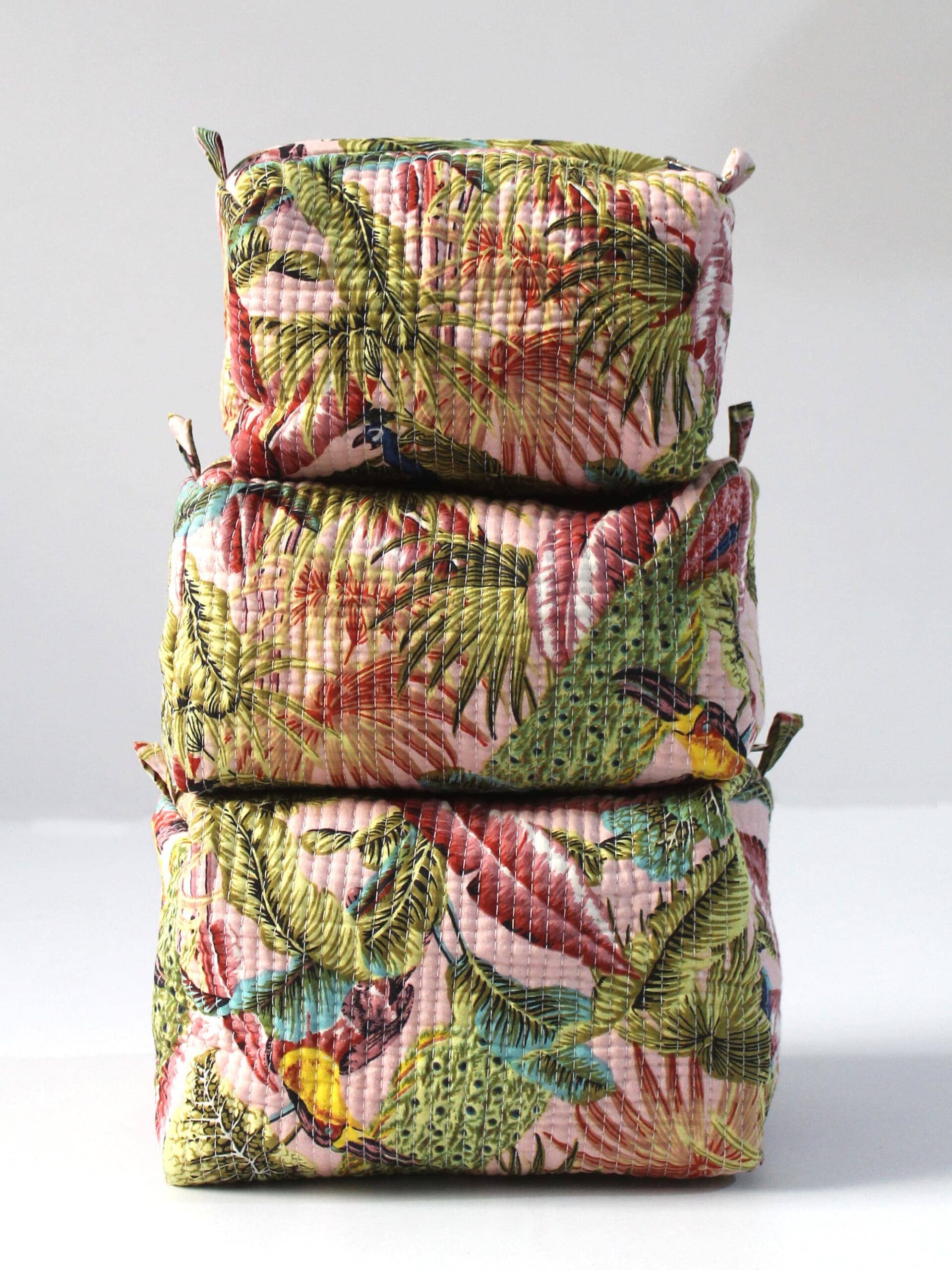 Bring vacation vibes to your vanity with our Tropical Paradise Quilted Cotton Makeup Bags! Featuring a vibrant tropical print in shades of pink, green, and yellow, these handmade cotton pouches are perfect for organizing your makeup, skincare, or travel essentials.