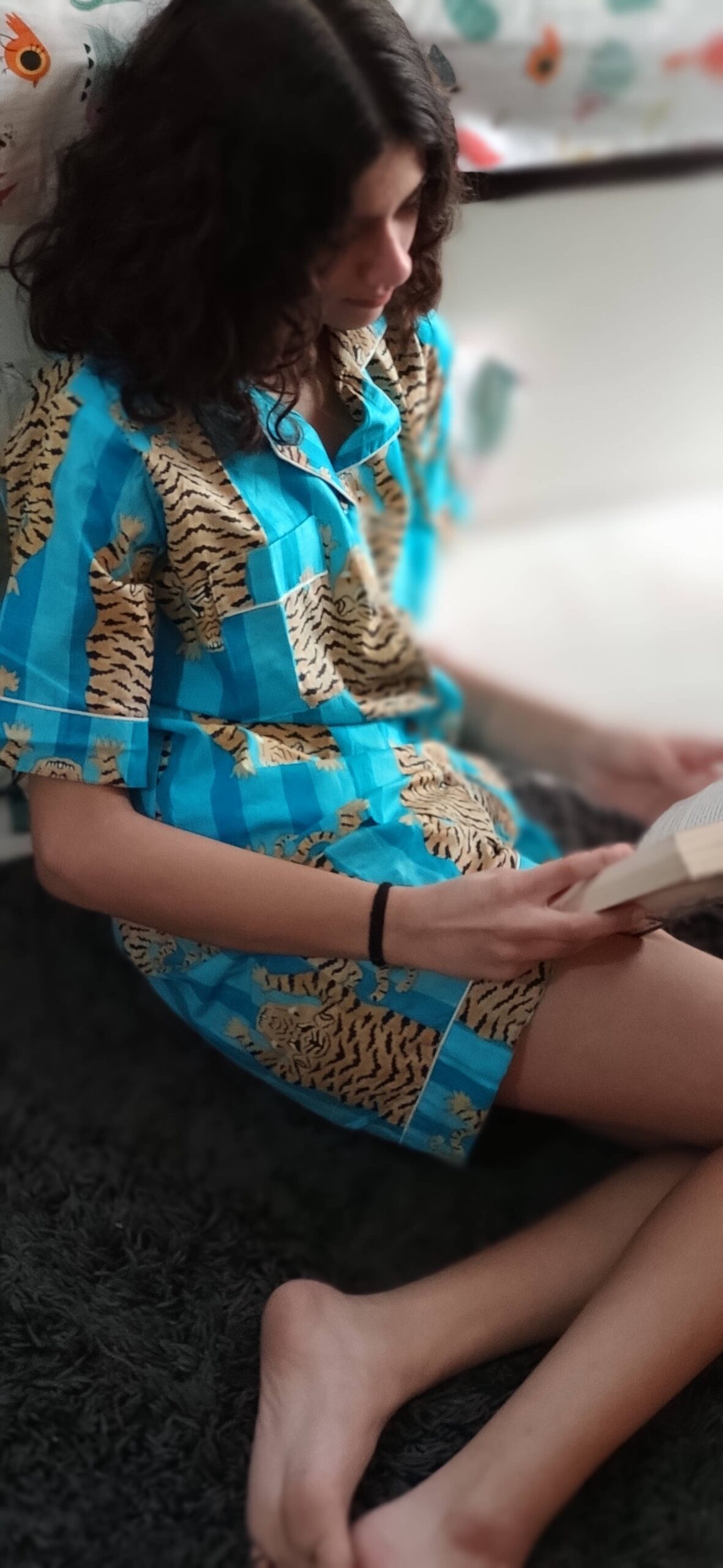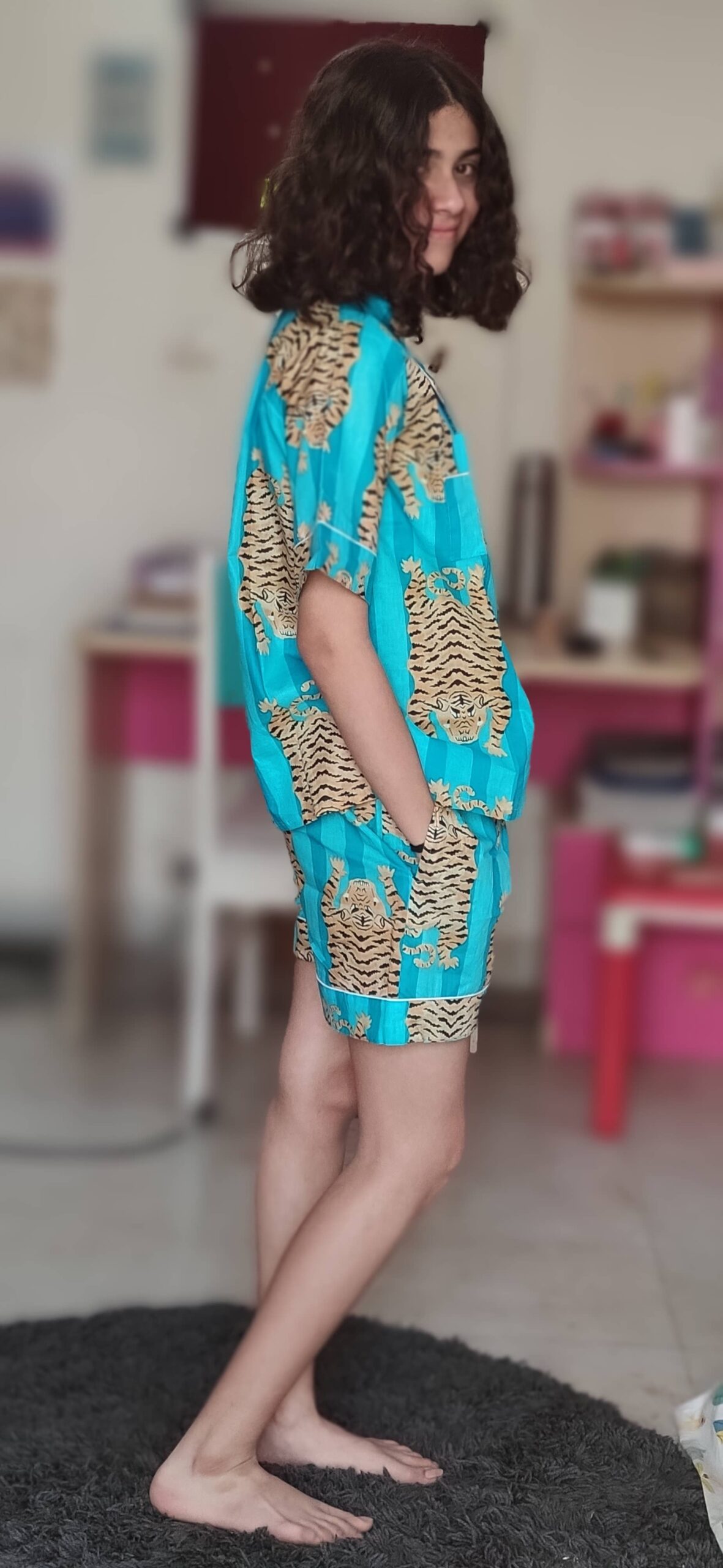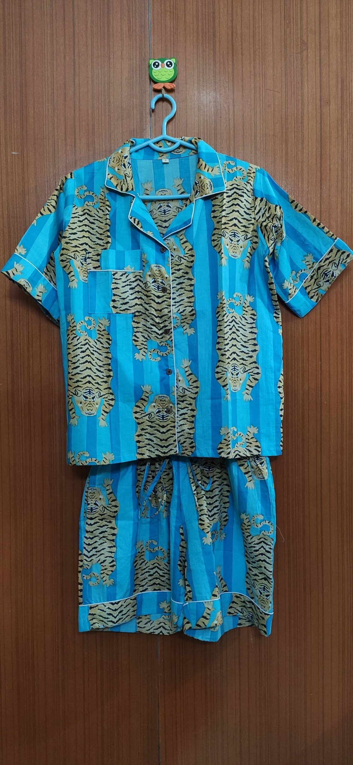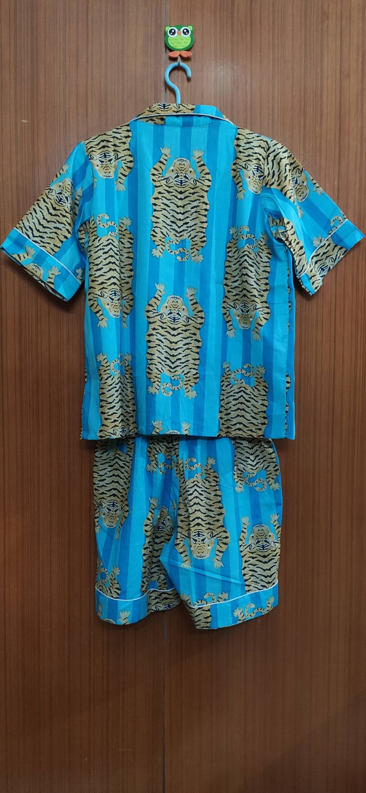 Be the first to review “Turquoise Blue Cotton Tiger Print Shorts Pyjama Set”