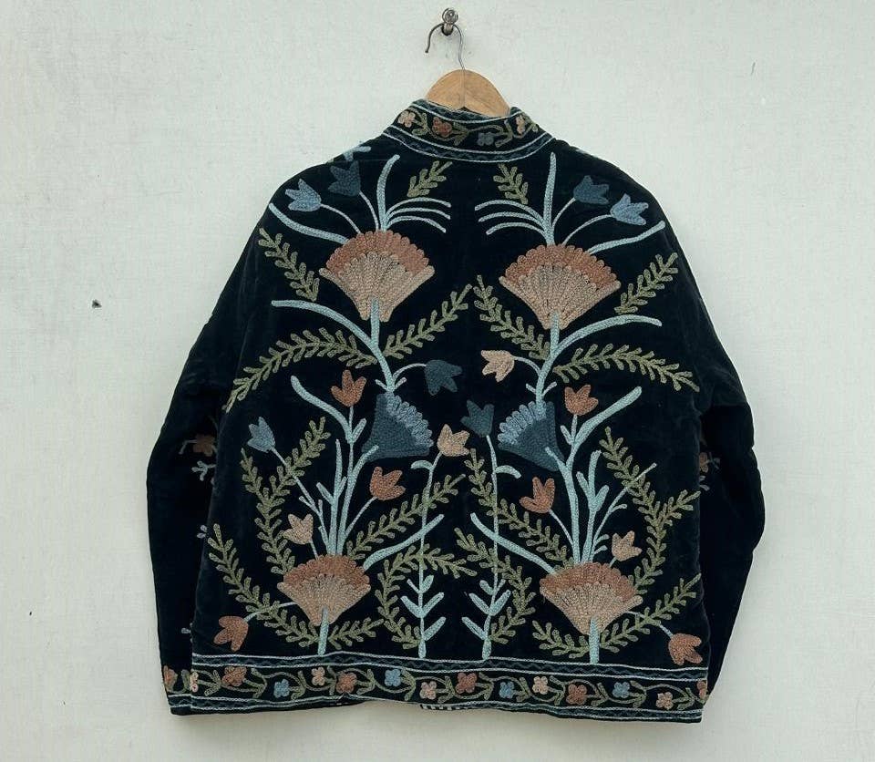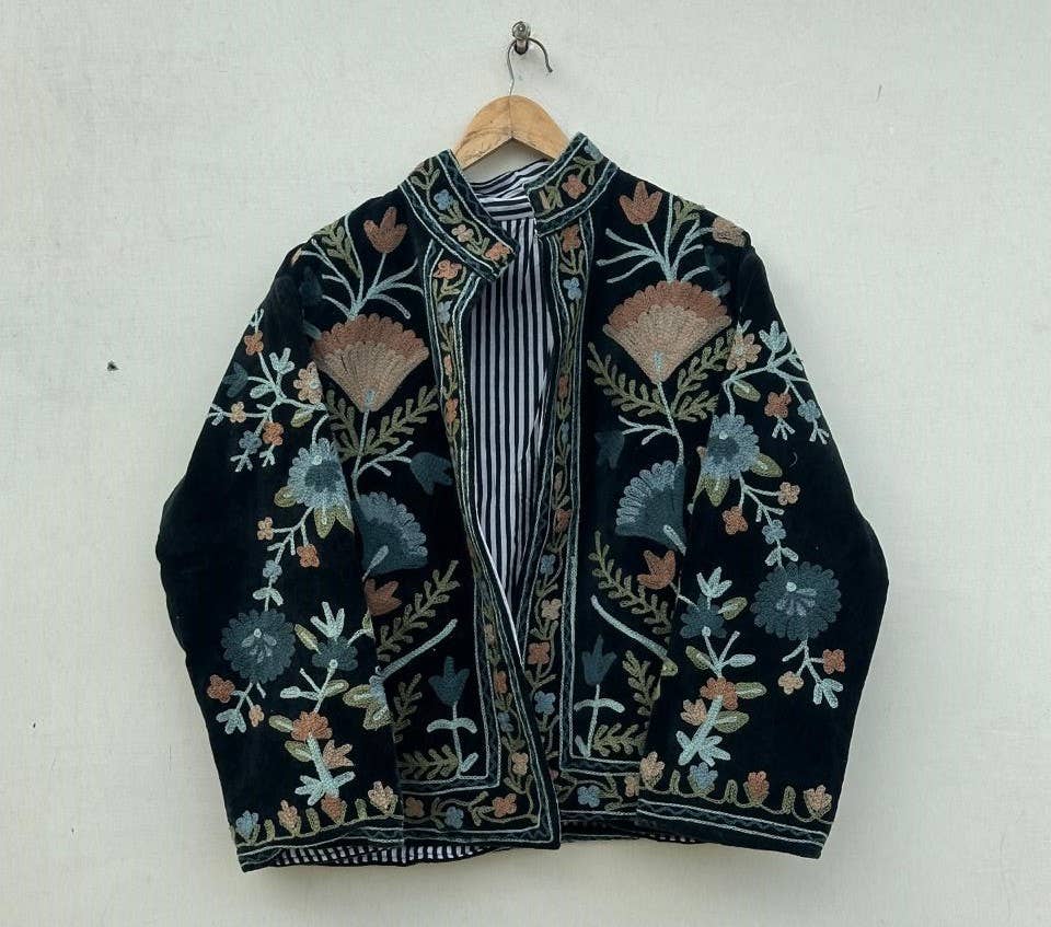 This jacket is made with velvet fabric and then the suzani is embroidered which is the specialty of this piece.