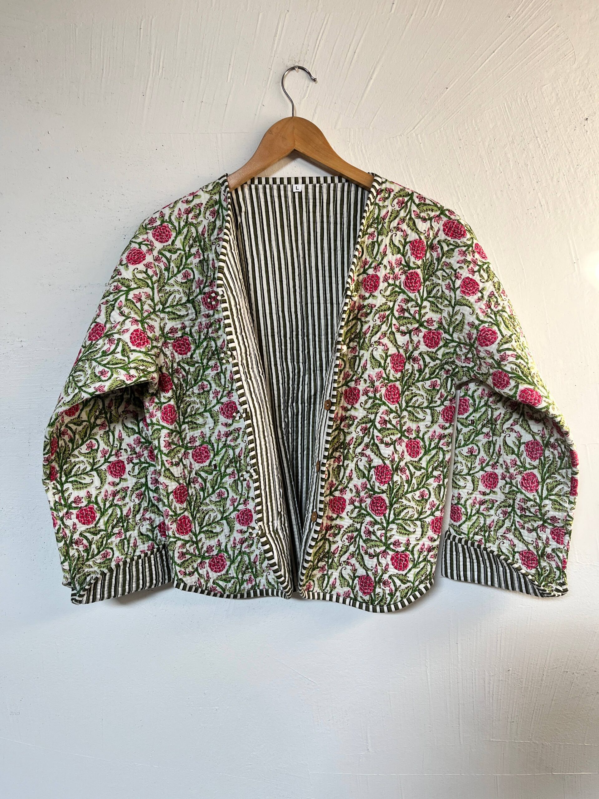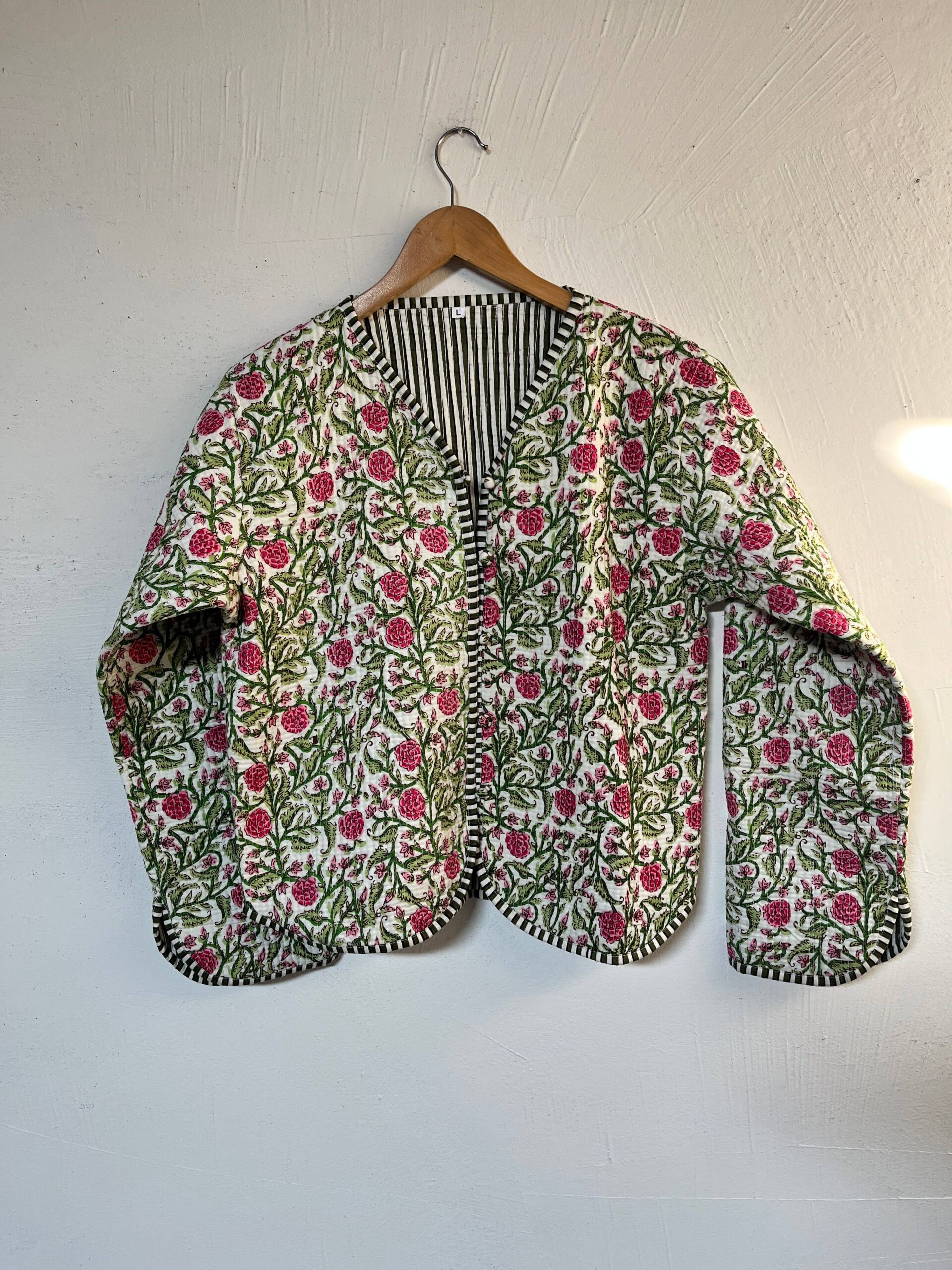 Crafted from high-quality cotton, our reversible quilted jacket has two front pockets, and handmade cotton buttons. The jacket is fully reversible, featuring a solid color/striped fabric on the inside, allowing you to switch up your look depending on your mood or outfit.