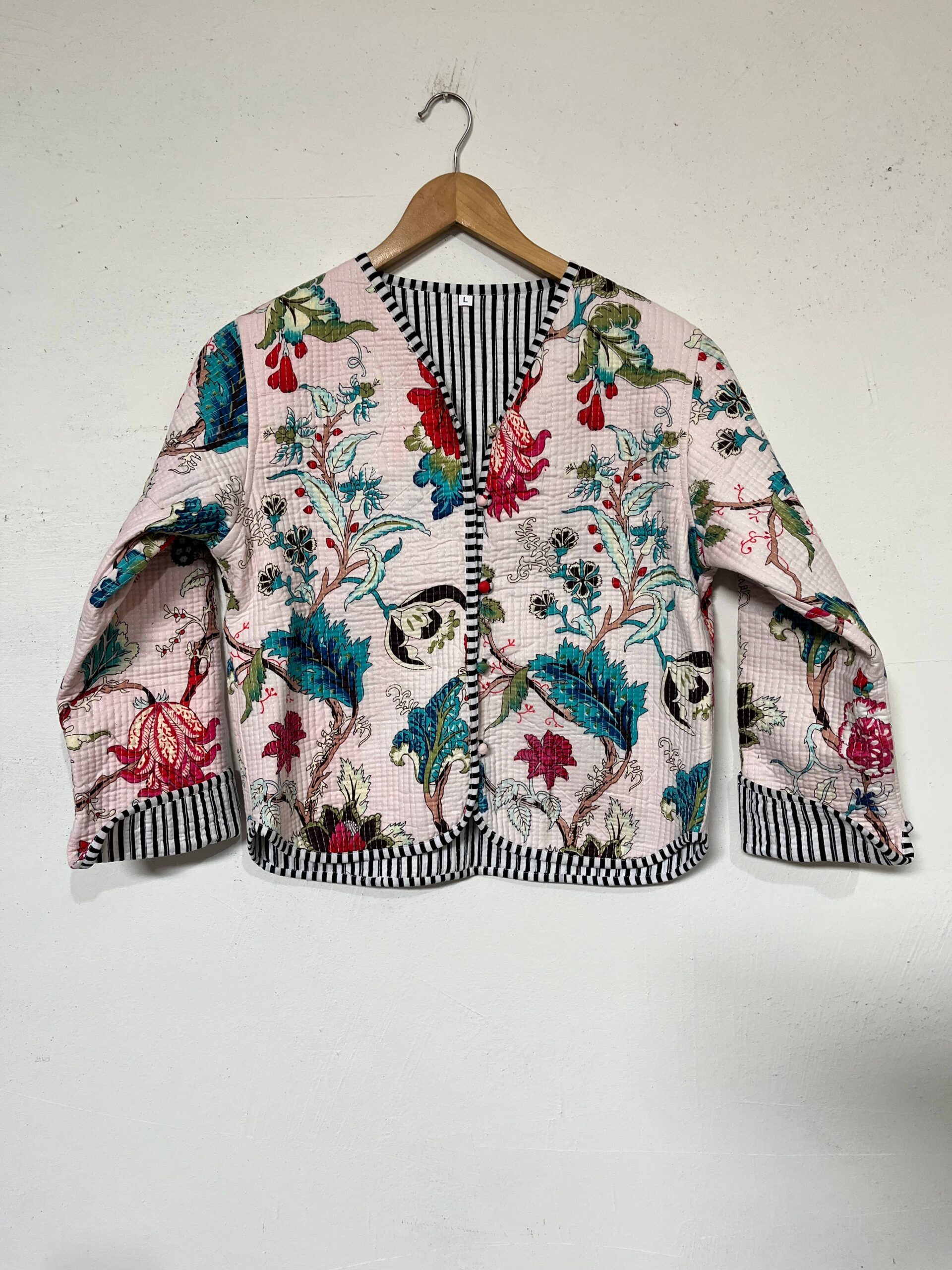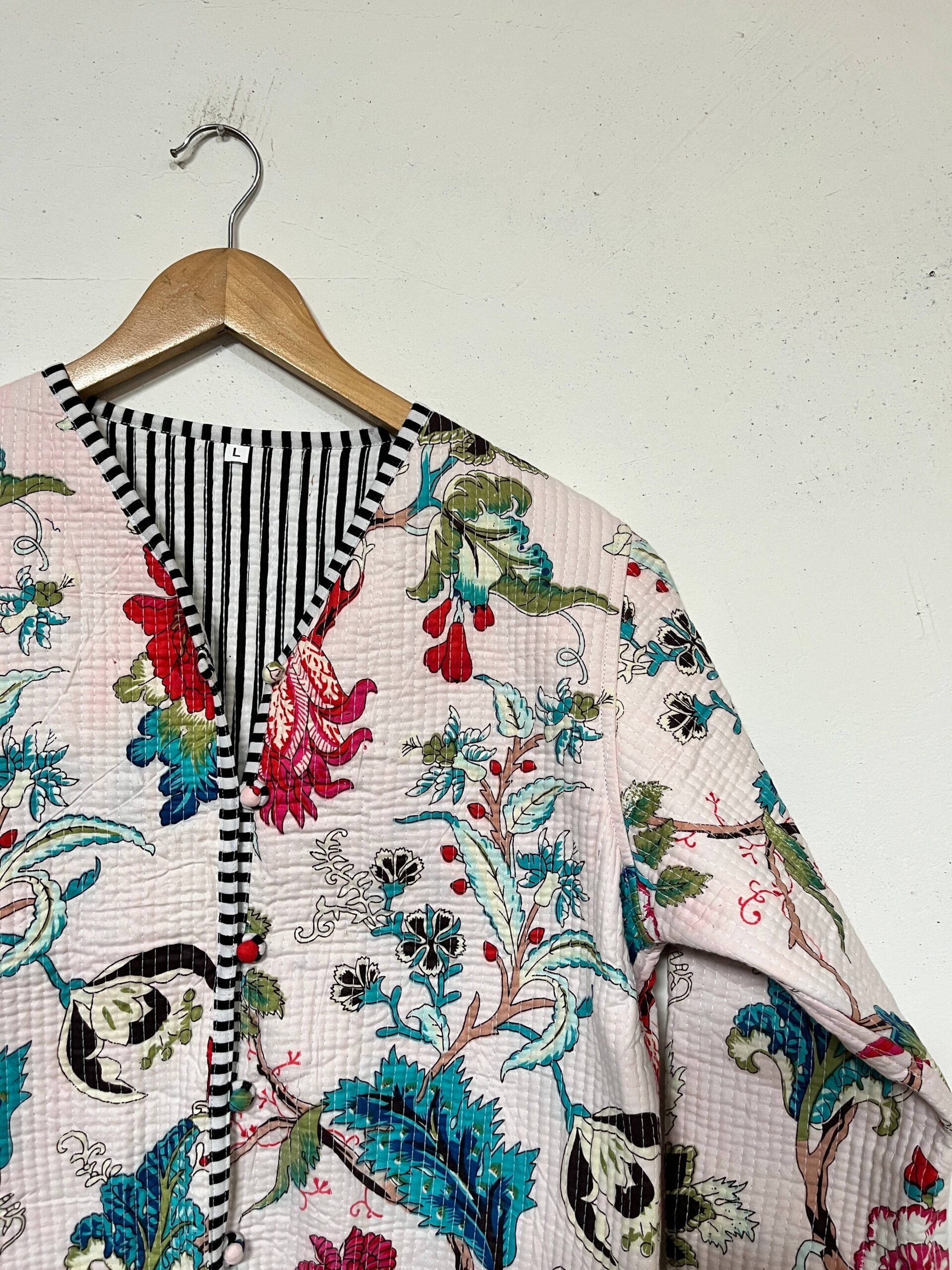 Crafted from high-quality cotton, our reversible quilted jacket has two front pockets, and handmade cotton buttons. The jacket is fully reversible, featuring a solid color/striped fabric on the inside, allowing you to switch up your look depending on your mood or outfit.
